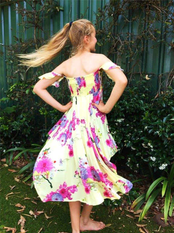 The pull-on dress that styles one way for younger girls and differently for tweens. Straps with butterfly sleeves on the shoulder for younger girls, and off the shoulder for tweens. Twirl around and feel like a princess or a pop star!