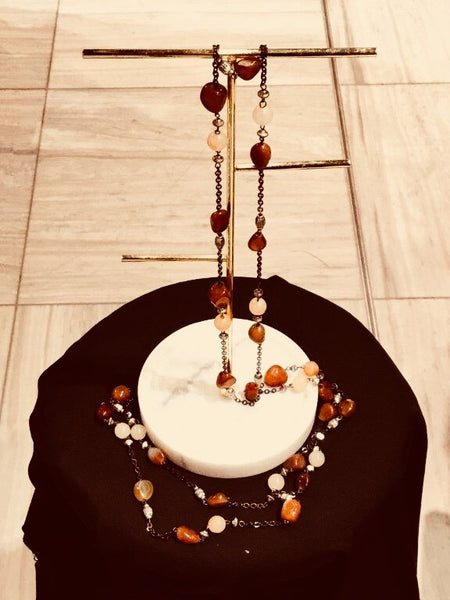 Glass beads resembling amber and agate gemstones with antique silver coloured metal beads and chain. Twist it around your wrist bracelet style (see our product ‘Tahiti Jumpsuit’ to see how this looks), or several times around your neck (see our product ‘Tina Sundress’ in colour ‘Tropical Garden Red’ to see this look).